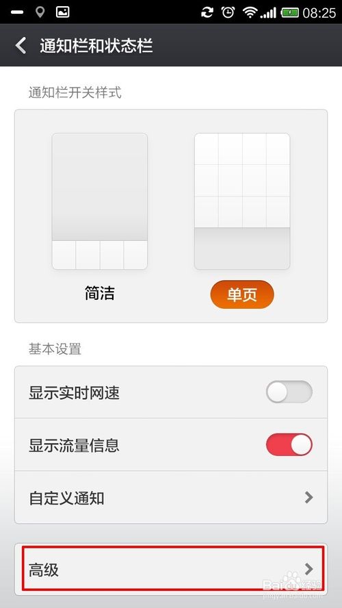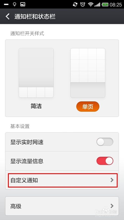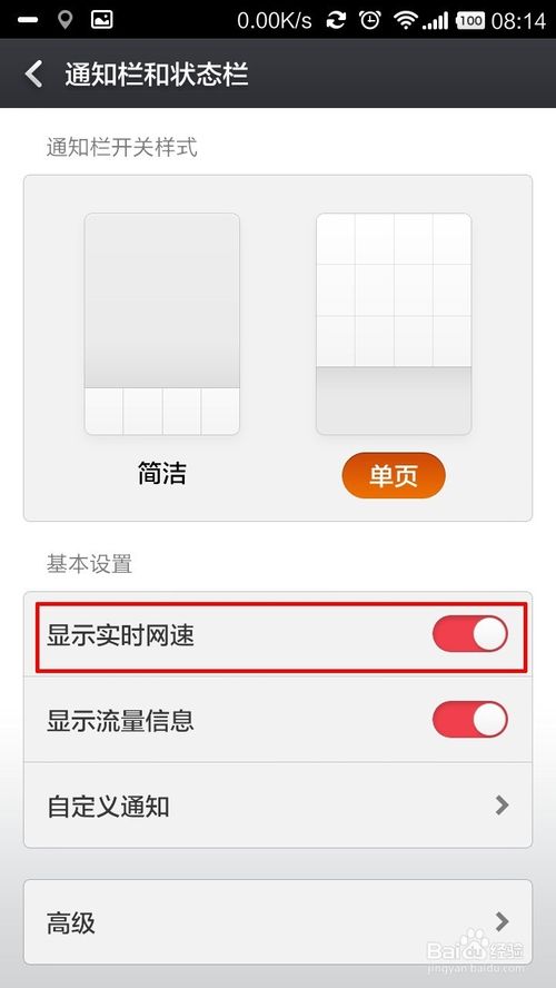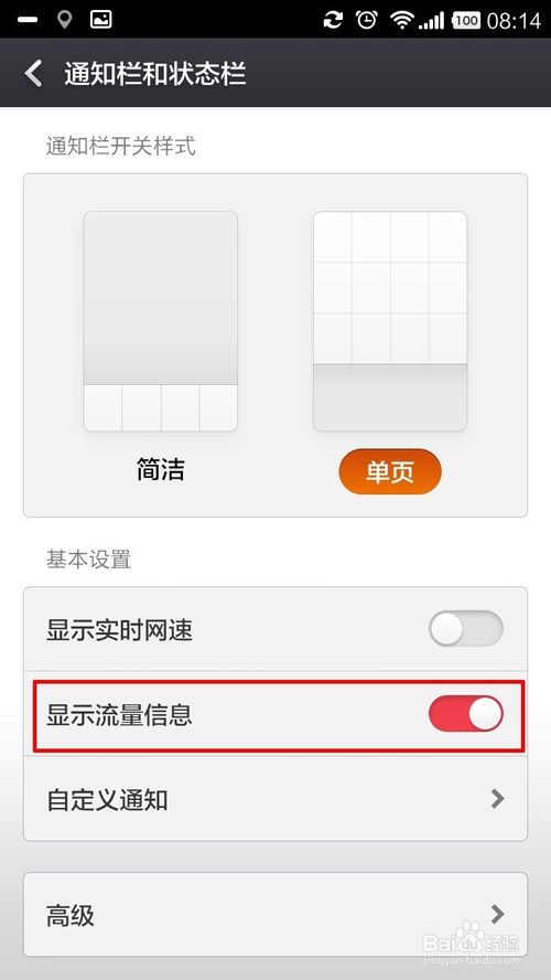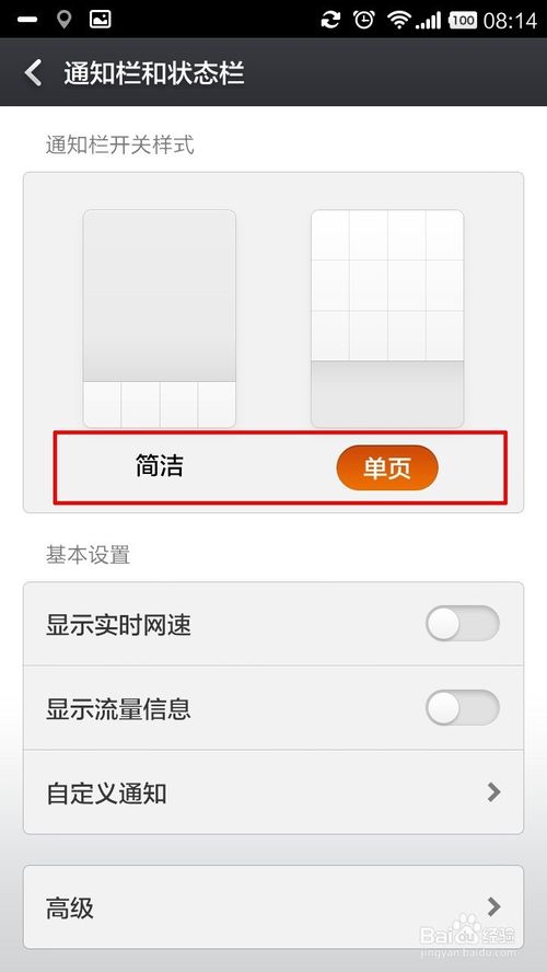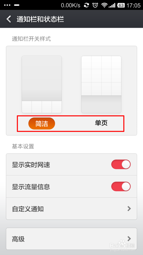 2、点击进入后,你会发现开关样式有“单页”和“简洁”。默认我们一般为“单页”,在手机的屏幕上方用手指按住向下拉,将"通知栏"拉下来,这就是你现有的通知栏信息。你就会发现我们的通知栏分“通知”和“开关”此种显示方式为默认设置,所下图所示