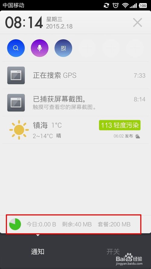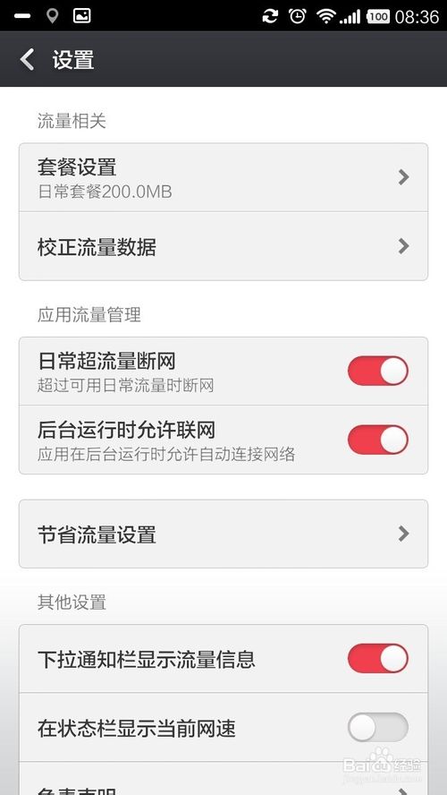 5、在“显示实时网速”的下方还有个“显示流量信息”的开关,打开后你可以在下拉通知栏中发现那个红色区域,主要的查看总的流量消耗情况而非实时。如下图所示
