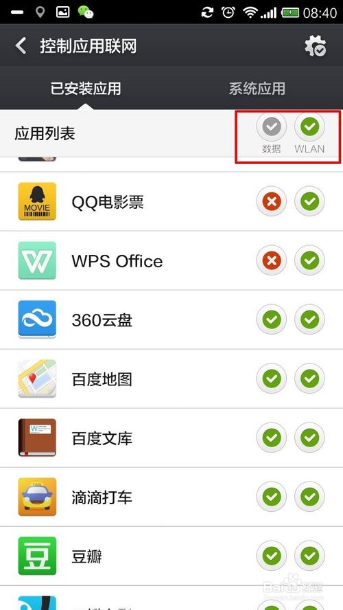7、在这里我还是讲一下“联网控制”,点击进入后你可以对你安装的应用程序的上网进行控制,分别是“数据”(移动网络)和“WLAN”(WIFI网络)这两个按钮为批量性的设置,而程序对应的叉和勾则是对应单一程序而言。这极大程序上的便捷了我们操作上的便捷性。流量的多少就意味着我们金钱的花费,所以管控好自己的程序流量是很重要的事情,如下图