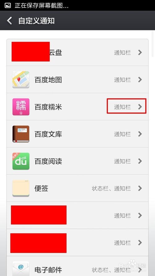 8、接下来回到“通知栏设置”的“自定义通知”,这个的作用是将我们自己安装的应用程序的通知信息反映在“状态栏”或“通知栏”以便我们知道。操作也很简单,点击你需要设置的程序,进行开和关的操作即可,如下图所示