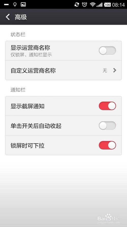 9、“通知栏设置”的高级如“显示截屏通知”、“锁屏时可下拉”等都是很简单的个性化设置,我就不一一操作了。如下图