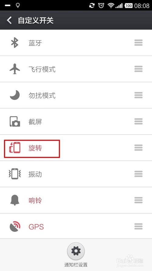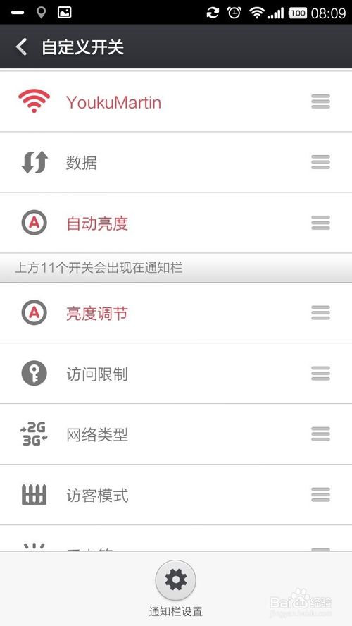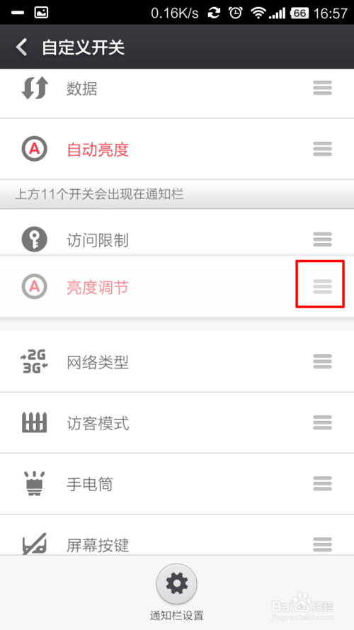 3、当你按住某个快捷键的右边“三杠”,将其拖放到那个红色区域的上方即为“添加”,拖到下方即为“删除”。你还可以通过拖动来改变,通知栏开关的前后顺序。如下图