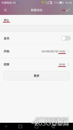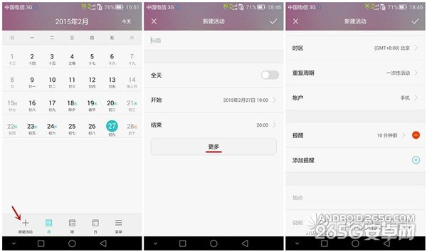 接下来,我们要去看的是具体怎么去使用这款日历应用。从新建活动开始,点击之后可以详细的对活动时间、地点和提醒等进行相应设置。