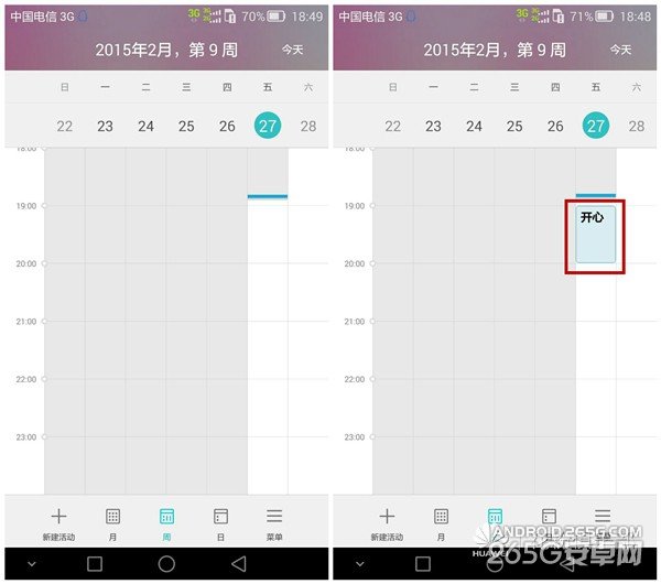 保存之后,在三种显示方式中,都有相关的显示,并且在周和日的显示方式中,也对活动的持续时间进行了显示。