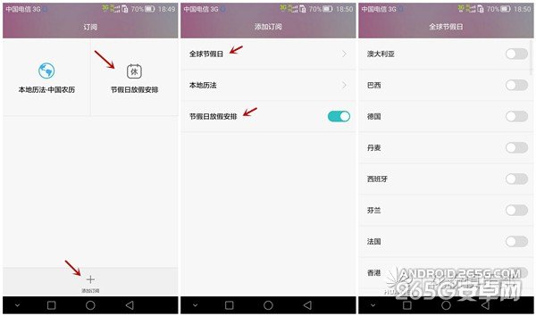 而节假日放假安排中,也是提供了很多国家的节假日的订阅,并且可以选择开关假日放假安排。