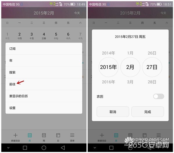 接下来是撸主认为很重要的一项,前往,可以去向指定的任何一天,很方便很实用的功能。而在要显示的日历中,则可以同步Exchange帐户。