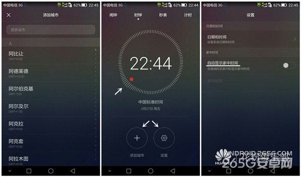 时钟界面,也可以添加城市并进行相应设置。时钟圆圈不断走动,秒数的具体动态显示,科技感十足。