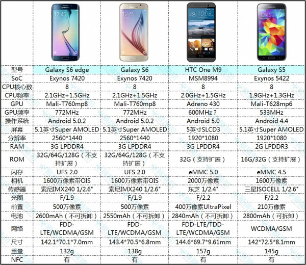 最后我们来对比一下Galaxy S6、Galaxy S6 edge、HTC One M9以及Galaxy S5的配置,以下以国际版为准,Galaxy S5以3G八核版本为准: