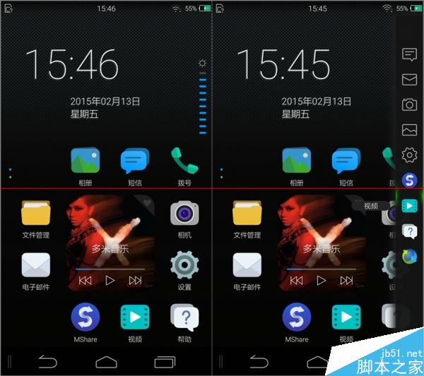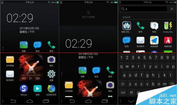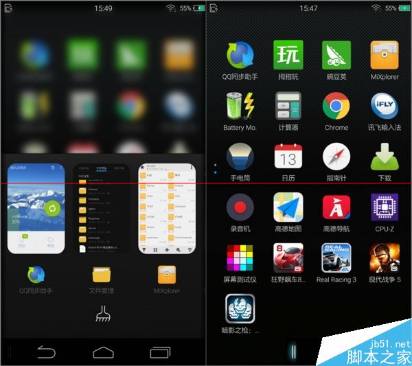 应用界面为纵向滑动,现在采用同样方案的大厂貌似只剩下HTC了。下拉可以直接进入半屏模式,方便点到顶部的程序,再次下拉也会调出搜索框。