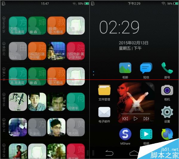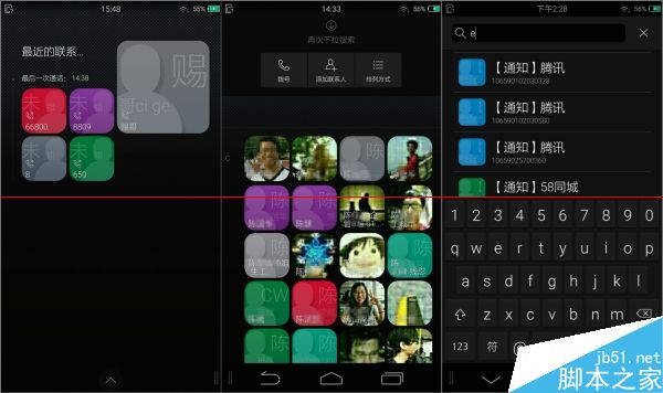 联系人界面支持图标和列表显示,并会显示用户的操作记录,往下拖动可以调出拨号、添加联系人、更改排序等功能按钮,再次下拉可以调出搜索工具栏。