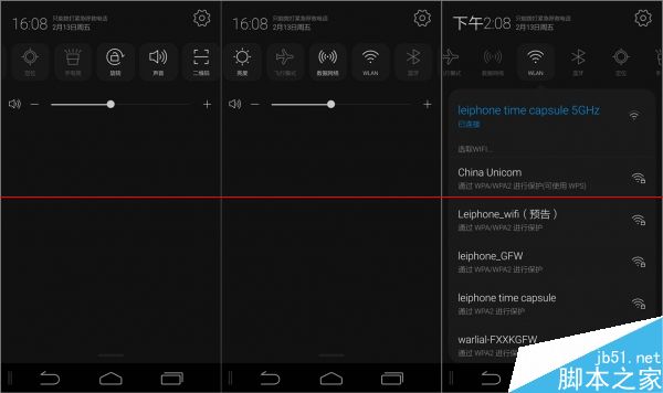 通知栏顶部是可以左右滑动的快捷开关,其下方是音量调节滑块。快捷按钮里面居然还有二维码快捷键,长按按钮可以在下方弹出详细设定页面,对亮度、wifi连接进行直接控制,用起来比较方便。