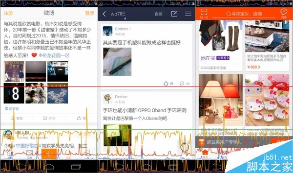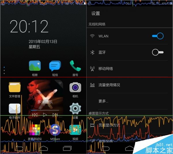实际使用中,打开GPU呈现曲线后,manta 7x的流畅性表现虽然还很好,但黄线一直维持在较高的位置,情况和之前评测的motoX非常相近,不过它们的曲线很少突破绿色的60帧警戒线,实际体验根本感觉不出卡顿。