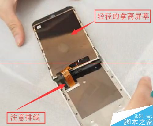 第三步:轻轻的拿开屏幕至机身的二分之一,注意在屏幕与机身之间有排线的存在,拿开屏幕时注意到排线的位置