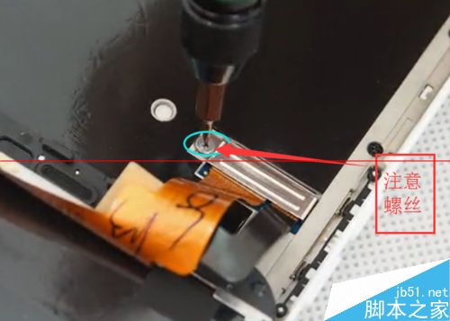 第四步:屏幕与触控的排线是用金属盖片保护着,首先用螺丝刀拧下图中所标记的螺丝,然后用镊子取下金属片,用撬棒分离与主板相连的排线。