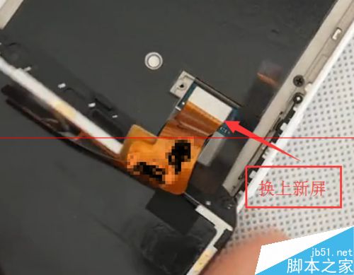 第五步:将新屏放在机身上方,用手指将排线与机身固定,然后拧紧金属盖片上的螺丝