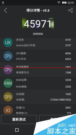 性能跑分虽然已经不再重要,但依然可以成为一个参考标准,老牌评测软件安兔兔是必看的项目。其通过内存性能、CPU整数性能,CPU浮点性能、2D、3D绘图性能、数据库I/O、SD卡读、写速度等多项性能测试,并对手机的整体和单项硬件性能做出评分。金立ELIFE S7最终跑分45971分,得分处于上游旗舰水平,这个分数下,日常使用没有任何顾忌,大型3D游戏以及多线程应用都可以轻松应对。