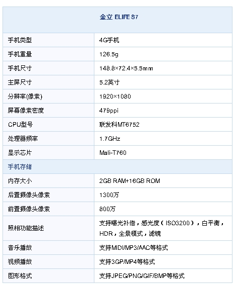 硬件方面,金立ELIFE S7搭载有1.7GHz主频的联发科MT6752八核处理器;手机内存为2GB,机身存储空间为16GB。此外,该机还支持 GSM/TD-SCDMA/TD-LTE/LTE FDD/WCDMA网络制式,支持移动和联通的3G/4G网络。