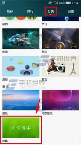 1)打开华为Mate7的【主题】,在【分类】栏选择【字体】;(如下图)
