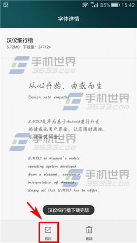3)等待下载完成后,点击【应用】,就可以为你的华为Mate7换一个字体了。(如下图)