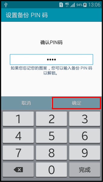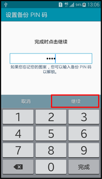 7. 输入备份PIN码,点击【继续】。(如果您忘记所设置的图案,您可以输入备份PIN码以解锁。)