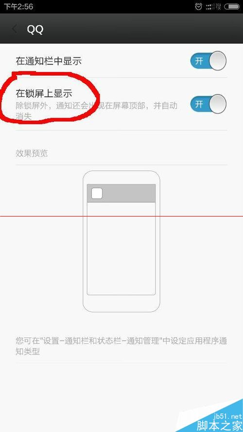 6、点击QQ后会出现:在通知栏中显示 /在锁屏上显示 ;这两个选项,将——在锁屏上显示 这一项关闭,以后锁屏状态时,QQ信息就不会再显示出来了。