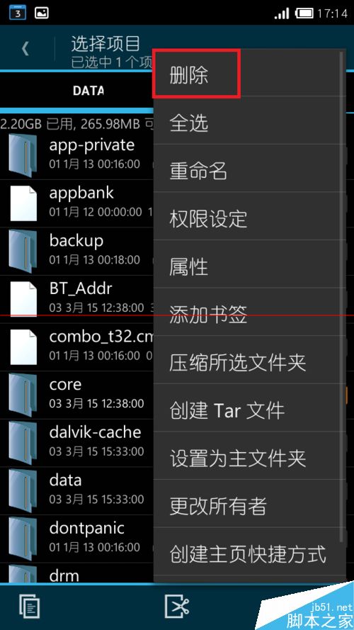 3、这部分空间会占用显示在“其他”一项的内部储存空间,所以我们要做的就是将其删除,勾选该文件夹,然后选择菜单中的“删除”(注意,由于系统方方面面可能存在些差异,所以建议删除前,先备份一下自己的手机中的重要资料,如通讯录、短信等,以免万一手机无法开机):