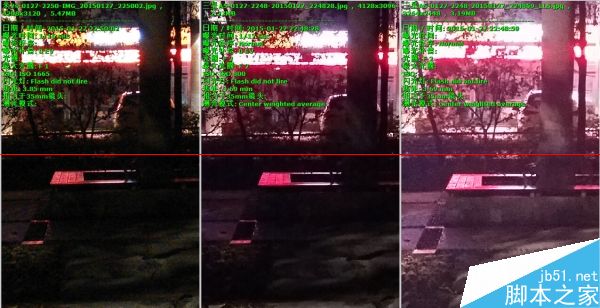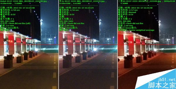 马路边这种室外弱光下,米2s和三星A5都已经用尽了ISO,分别为1665和800。但小米2s的画面依旧偏暗。画面亮度最高的是Xshot,其次是A5(更接近肉眼所见)。除了米2的眩光控制不好外,其他两部都不错。
