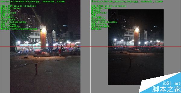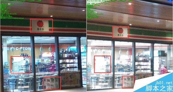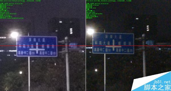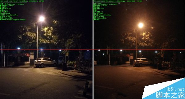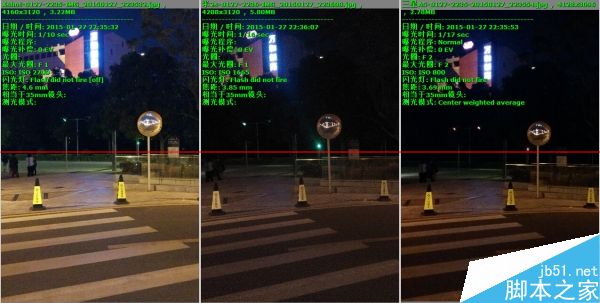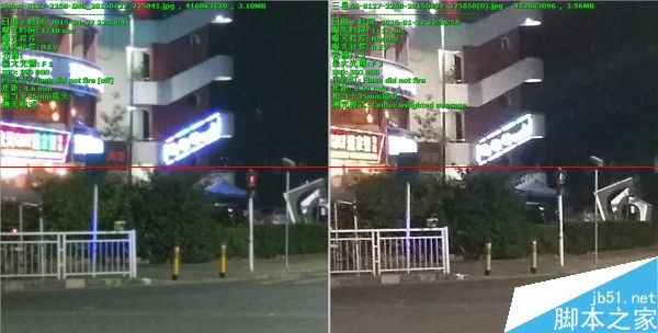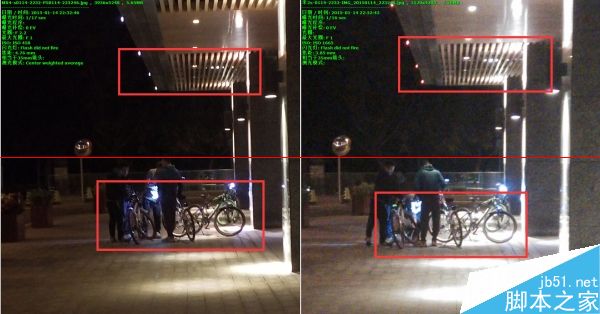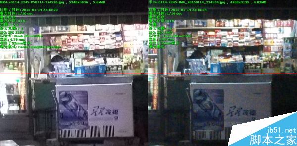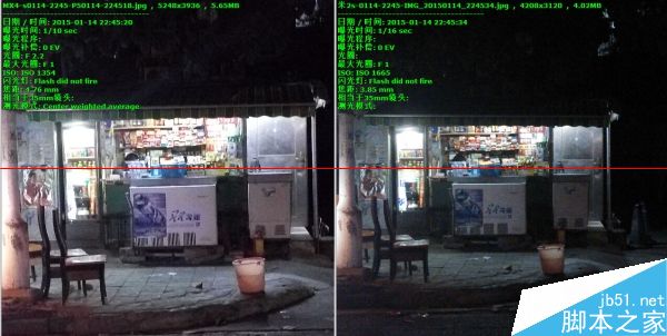当环境光线更强一些,店铺门前或路口等灯光更多的地方。右侧的小米2s,ISO(1665)和快门速度(1/16s)都没变,故画面亮度有大幅提升,超过了MX4和肉眼所见。