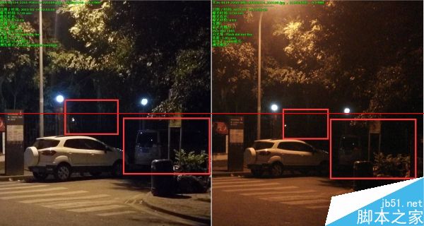 小米2s因感光能力不足,画面偏暗,丢失了大量的暗部细节,方框中的栏杆和面包车都差点看不见了。