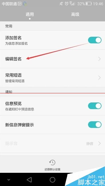 4、在荣耀6信息设置界面上,我们可以看到添加签名,点击后面的滑块就可以给信息添加签名,如下图所示。