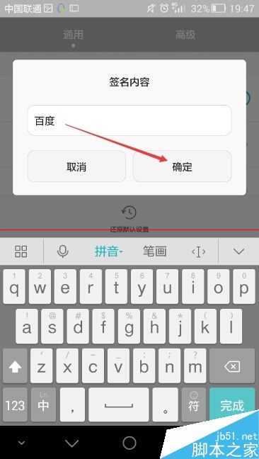6、点击弹出华为荣耀6签名内容对话框,我们输入签名内容后,点击确定,如下图所示。