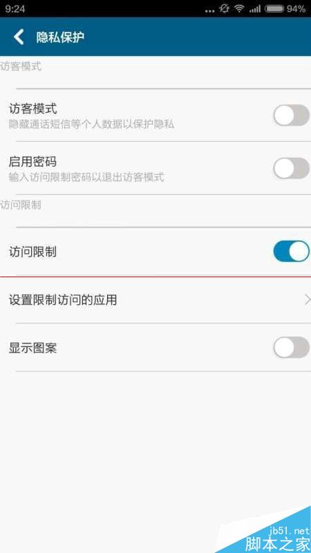 6、图案设置完成后,界面自动回复到“隐私保护”,选择“设置限制访问的程序”,如图所示: