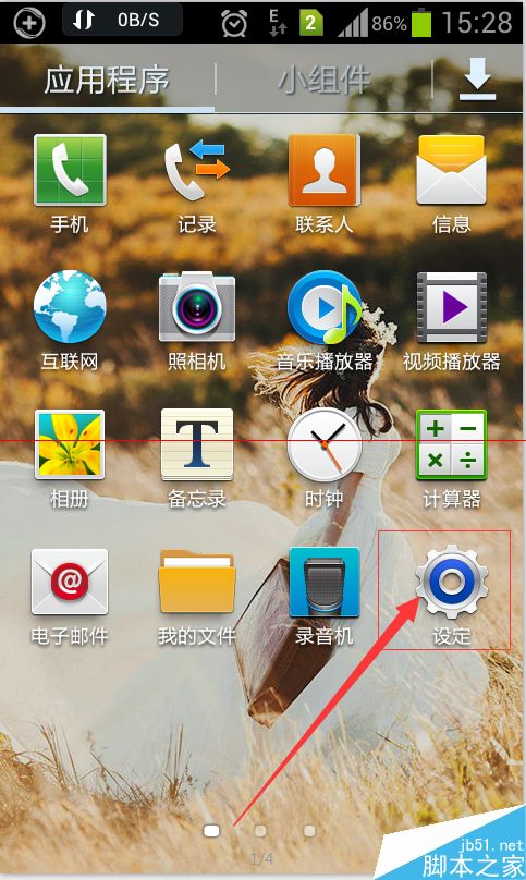 2、备份完成后把SD卡安装到手机上,如下图所示,找到手机的【设定】程序并打开。(有些手机可能叫做“设置”)
