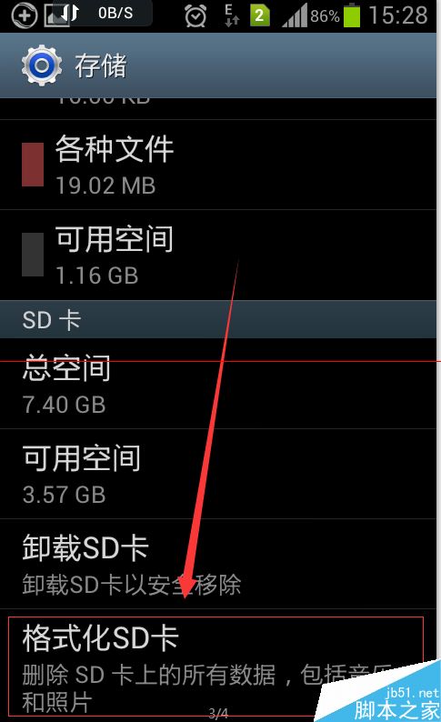 4、点击【储存】即可进入看到储存空间使用情况。找到如下图标记的【格式化SD卡】选择格式化SD卡。