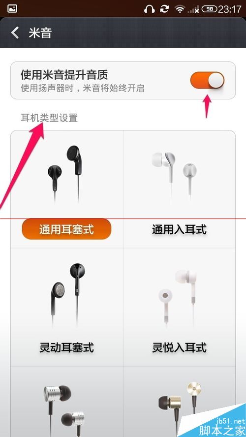 4、进入米音设置界面后,开启米音,选择耳机类型。