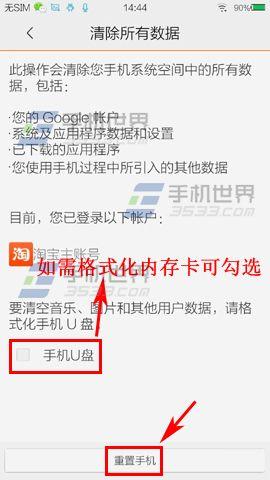 2)点击【清楚所有数据】,如果需要一起格式化内存卡的话可以勾选【手机U盘】,最后点击下方【重置手机】。