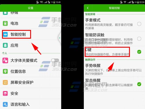 2)如需关闭/开启,我们需要进入酷派大神F2的手机【设置】找到【智能控制】,将【C键】取消/勾选即可。(如下图)