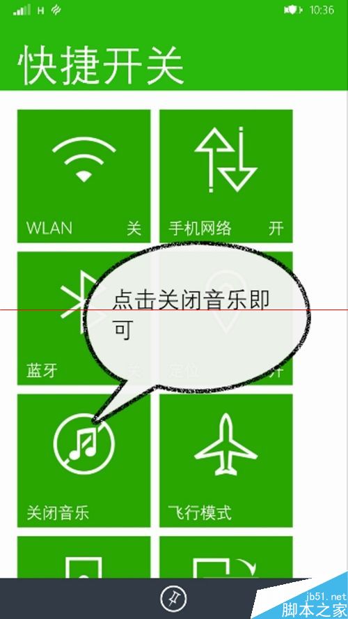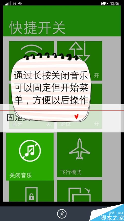6、此外,通过长按 关闭音乐,可以固定到开始界面,方便以后使用。