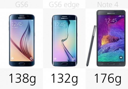 Galaxy S6/S6 Edge作为三星的新旗舰开始使用金属框架+双面康宁大猩猩玻璃的设计,所以在重量上得到了进一步优化。Galaxy S6在重量上要比Galaxy Note 4轻22%,Galaxy S6 Edge在重量上要比Galaxy Note 4轻 25%。