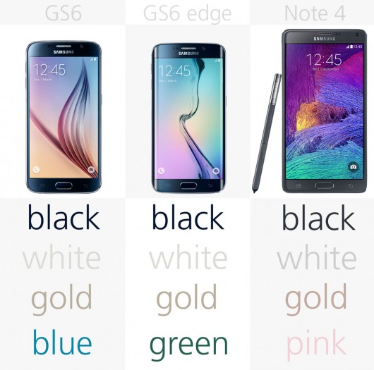 三款设备都有四款颜色共消费者选择,除了白色、黑色和金色之后每款设备都有各自不同的专属颜色,例如Galaxy Note 4具备粉色的。
