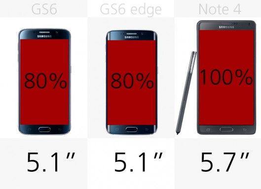 在大屏时代Galaxy S6/S6 Edge的尺寸尽管并不能说小,但是和Galaxy Note放在一起依然像是“弟弟”。Galaxy Note 4相比较两款Galaxy S6旗舰高8到9%左右,宽11到13%左右。