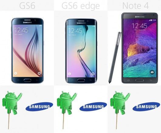 两款Galaxy S6旗舰在出厂时候搭载Android Lollipop系统,此外采用三星自家的TouchWiz界面,取消三星自家的预安装软件,但搭载微软的Office等软件。部分版本的Galaxy Note 4已经升级到Lollipop系统,但是依然有部分停留在KitKat版本。
