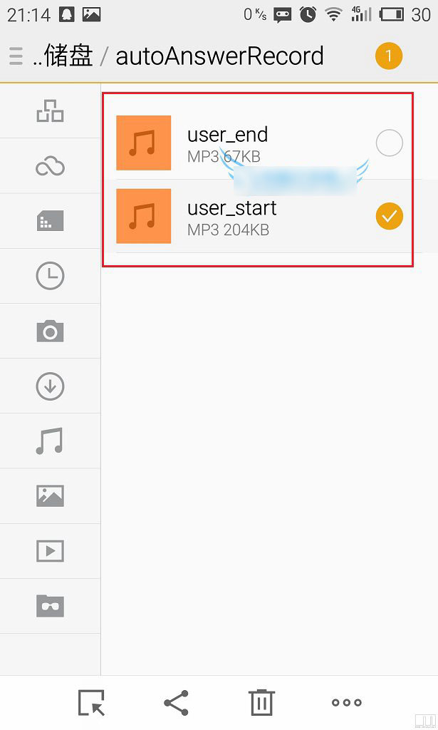 五.建立文件夹之后,进入autoAnswerRecord文件夹,然后把自己录制的音频文件放进去,注意录制的音频文件,名称一定要命名为:user_start和user_end,这两个文件是系统默认的文件名,其它名称无效。