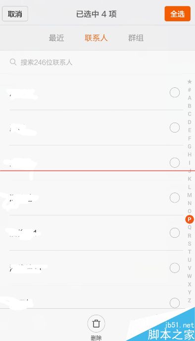 7、之后就是根据自己的需要把不需要的联系人找出来,一次性的找出来,也会看到你选择了多少个联系人的,选择完毕后,点击删除。