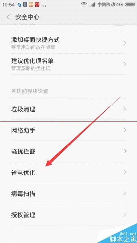 3、在安全中心界面,同时再向下滑动屏幕,找到省电优化菜单项