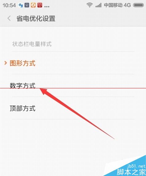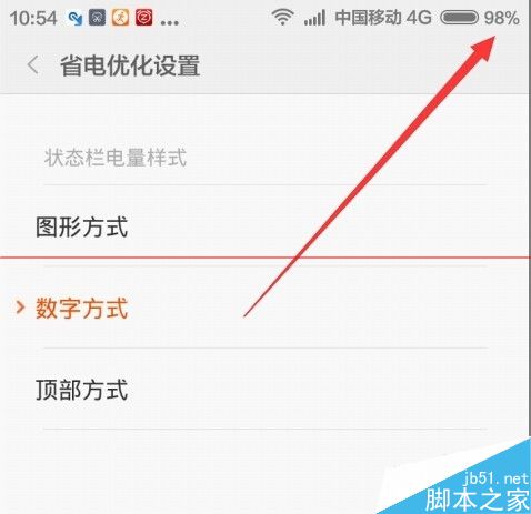 4、打开省电优化设置界面,在这里可以看到状态栏电量样式为图形方式,我们点击下面的数字方式菜单项