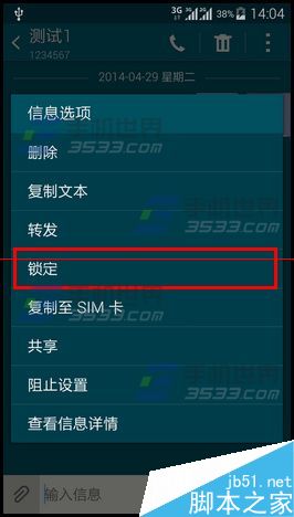 1)长按三星S6要锁定的信息,选择【锁定】。(如下图)