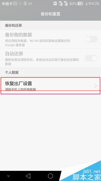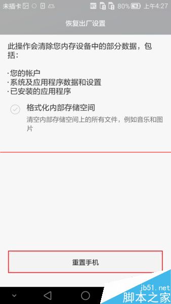 操作步骤,手机设置中,依次点击“备份和重置”->“恢复出厂设置”->“重置手机”(如下三图显示),手机重启后会完成恢复出厂设置,然后自动重启正常使用。