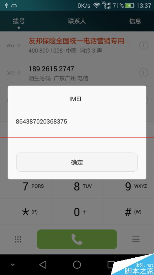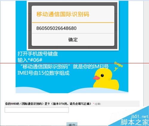 4、接下就是IMEI码,手机拨号键下,输入*#06#,就会弹出IMEI码!