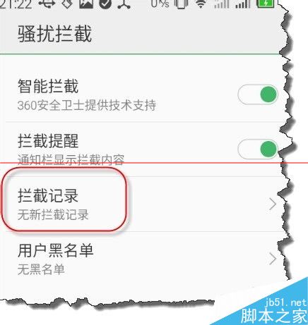 5、在”骚扰拦截“中点击”拦截记录“。如图所示。